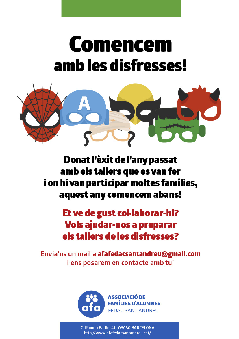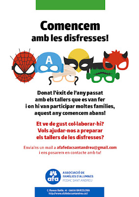 Si us ve de gust ajudar-nos a preparar els tallers de les disfresses, només ens ho heu de fer saber! Estem creant un grup de treball.